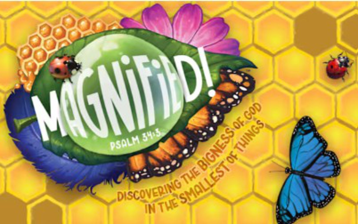 Magnified! VBS will encourage kids to look closely at the details of God’s amazing world and magnify, or proclaim, the greatness of God. God made us, cares about us, loves us, forgives us, and is faithful to keep all His promises to us. We can praise God together! We were made to magnify God!